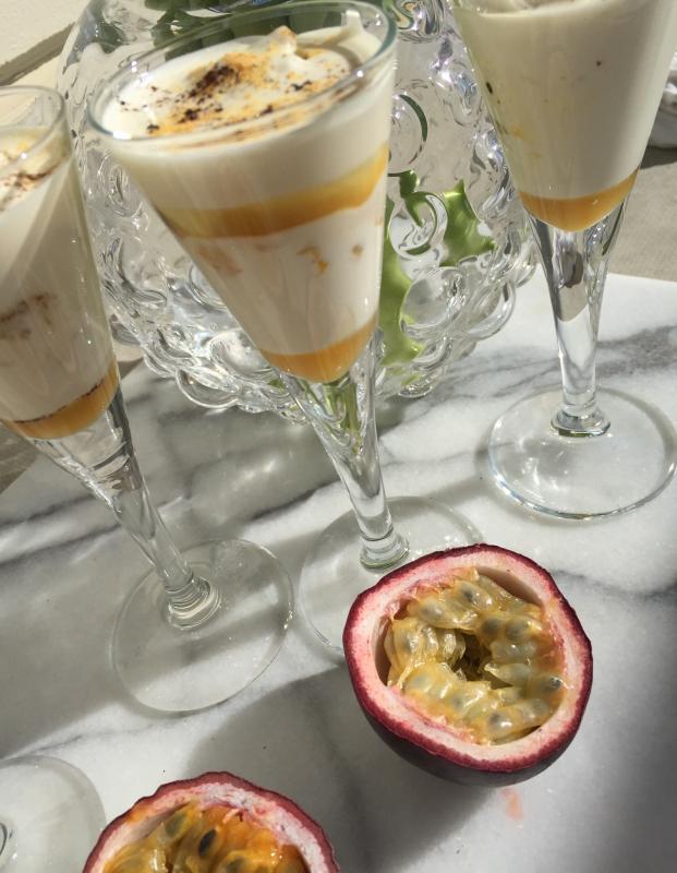 5. Varva kräm, sockerkaka, passionsfrukt och rålakritsströssel i små likörglas eller liknande. Ringla passionsfruktkolasås mellan varje lager.