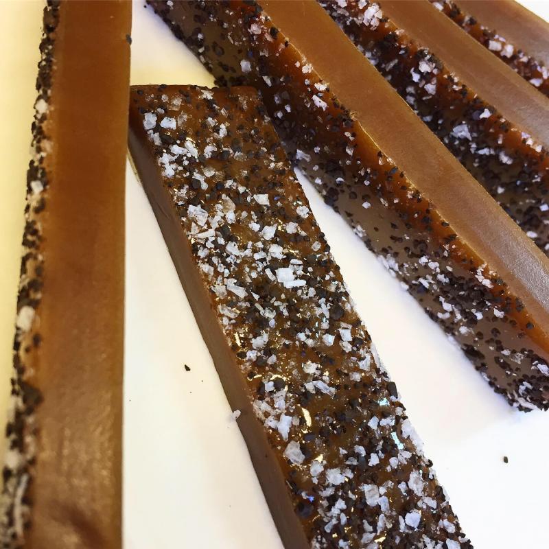 Lakritskola kokad på kokosgrädde och toppad med rålakrits och havssalt.