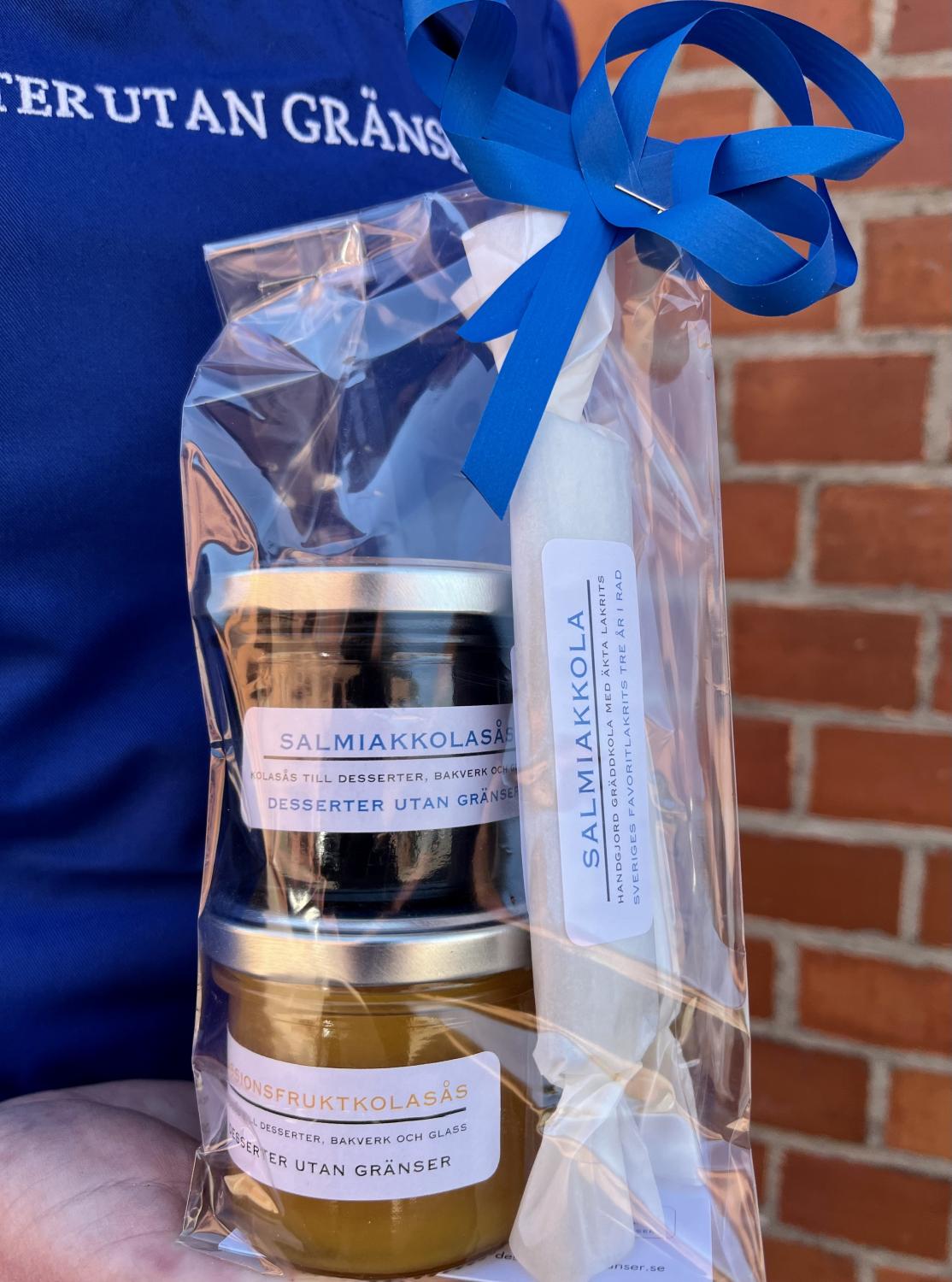 Innehåll: 3 Salmiakkola och 1 duo Passionsfruktkolasås och 1 Salmiakkolasås (vikt ca 135 g styck).